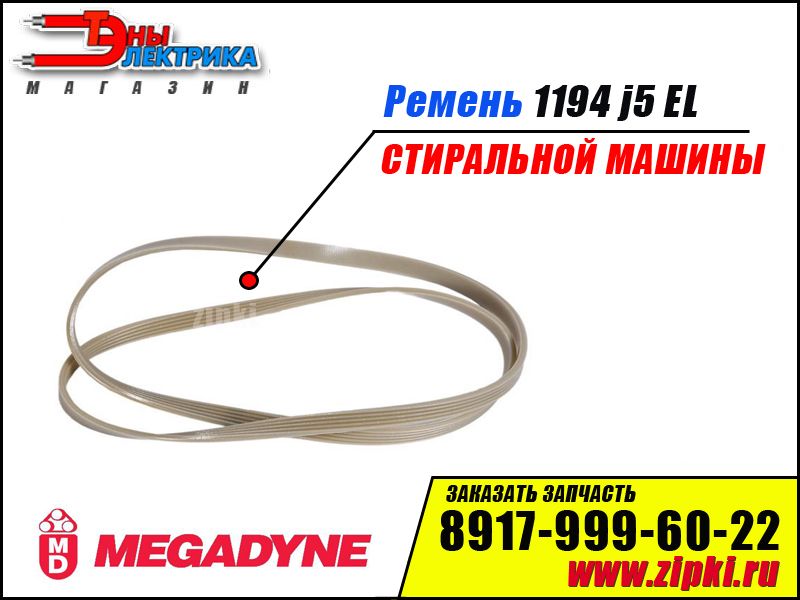 ОПИСАНИЕ: Оригинальный ремень привода 1194 J5 EL «Megadyne» для стиральной машины. Ремень необходим для передачи крутящего момента от приводного мотора машинки к баку. Если машинка перестала крутить барабан, это явный признак поломки приводного узла машинки, необходимо убедится в том, что ремень слетел либо порвался. Порватся и слететь ремень может по нескольким причинам: заклинило подшипники, погнуло шкив, ремень растянулся от времени.