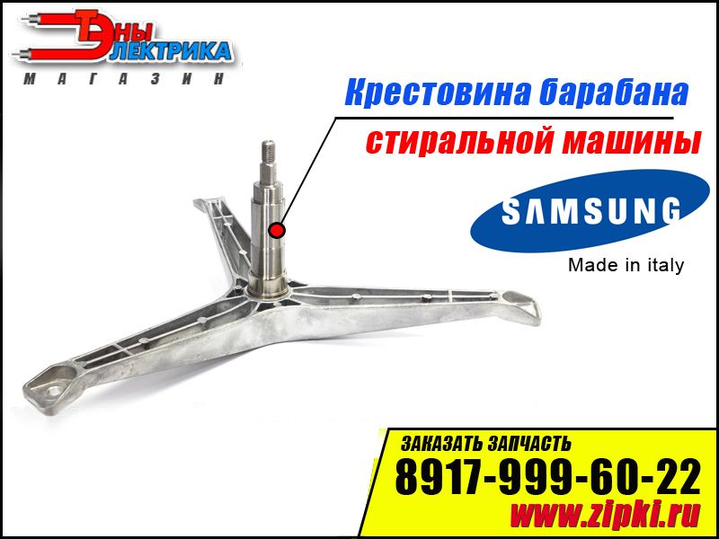 ОПИСАНИЕ: Оригинальная крестовина барабана для стиральных машин Samsung. Данная запчасть ломается редко, но если такое произошло, затягивать с ремонтом не стоит. Обычно причина поломки крестовины сопровождается искривлением барабана а также шумом похожим на выход из строя подшипников. Как правило у крестовин отгнивает один или два луча, также может провернуть ось от перегрузки (перегрузка бельем). Встречаются поломки связаны с износом втулки по которой ходит сальник и посадочному месту подшипника. Если запустить ремонт по замене подшипников посадочное место может расточить и подшипник будет сидеть не плотно, это приводит к более быстрому износу подшипников. Если есть данная неполадка, лучше заменить крестовину перед заменой подшипников.