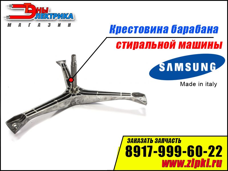 ОПИСАНИЕ: Оригинальная крестовина барабана для стиральных машин Samsung. Данная запчасть ломается редко, но если такое произошло, затягивать с ремонтом не стоит. Обычно причина поломки крестовины сопровождается искривлением барабана а также шумом похожим на выход из строя подшипников. Как правило у крестовин отгнивает один или два луча, также может провернуть ось от перегрузки (перегрузка бельем). Встречаются поломки связаны с износом втулки по которой ходит сальник и посадочному месту подшипника. Если запустить ремонт по замене подшипников посадочное место может расточить и подшипник будет сидеть не плотно, это приводит к более быстрому износу подшипников. Если есть данная неполадка, лучше заменить крестовину перед заменой подшипников.