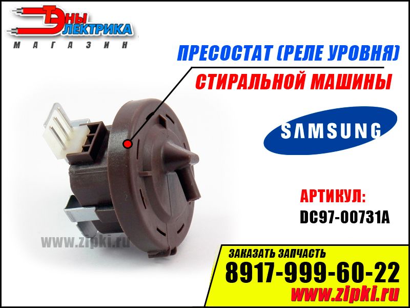 ОПИСАНИЕ: Пресcостат уровня воды / реле уровня воды / датчик уровня воды для стиральной машины Самсунг / Samsung, предназначен для измерения наполнения бака. В процесе стирки датчик сигнализирует программе наличие и отсутствие воды в баке. Поломка происходит редко , зачастую ломется датчик от излишнего пенообразования , такжде износ диметаллической пластины которая регулирует сам уровень!