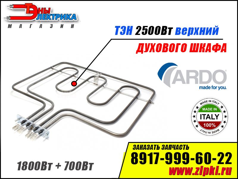 ОПИСАНИЕ: ТЭН верхний для духового шкафа популярной марки Ardo / Ардо. Данный нагревательный элемент устанавливается сверху духовки. Если ТЭН перегорает, духовка заметно теряет интенсивность нагрева, а также выпечка начинает недопекаться сверху и подгорать снизу.