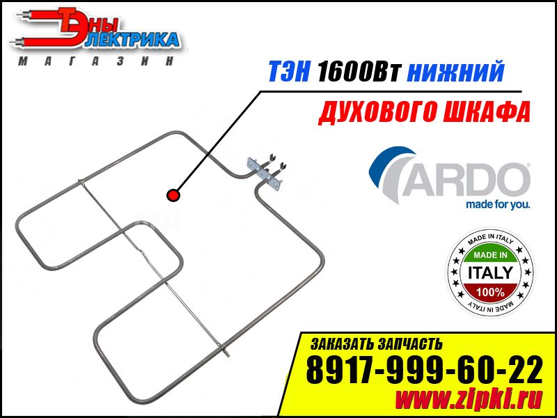 ОПИСАНИЕ: ТЭН нижний для духового шкафа популярной марки Ardo / Ардо. Данный нагревательный элемент устанавливается в нижней части духовки. Если ТЭН перегорает, духовка заметно теряет интенсивность нагрева, а также выпечка начинает с верху подгорать а с низу недопекается.