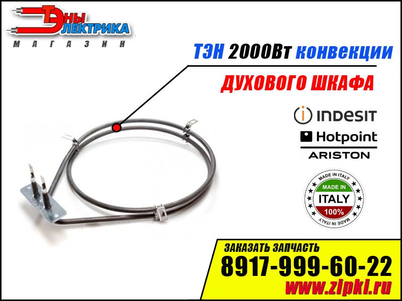 ОПИСАНИЕ: ТЭН конвекции для духового шкафа марки Hotpoint-Ariston / Indesit. Данный нагревательный элемент устанавливается на задней стенке духовки, закрывается перфорированной крышкой. Если ТЭН перегорает, духовка заметно теряет интенсивность нагрева, нужная температура просто не набирается либо очень медленно. При такой работе духового шкафа будет невозможно готовить выпечку и другие блюда.
