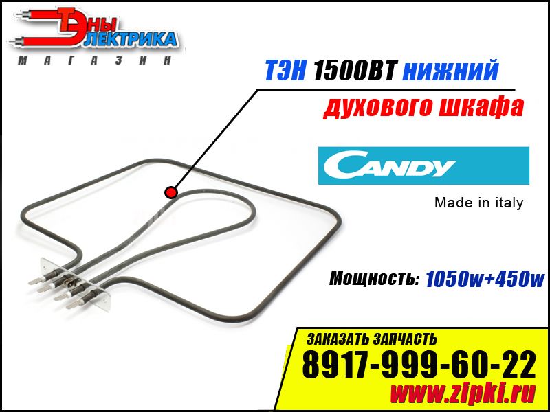 ОПИСАНИЕ: Нагревательный элемент духового шкафа Канди / Candy. Данный ТЭН устанавливается в нижней части духовки что способствует быстрому прогреву камеры духовки. Нагреватель общей мощностью 1500Вт состоит из двух тенов на одной планке : наружный тен мощностью 1050Вт и внутренний 450Вт. Если вы обнаружили что блюдо пропекается неравномерно либо духовка меделенно набирает необходимую температуру, это явный признак неисправности ТЭНов.