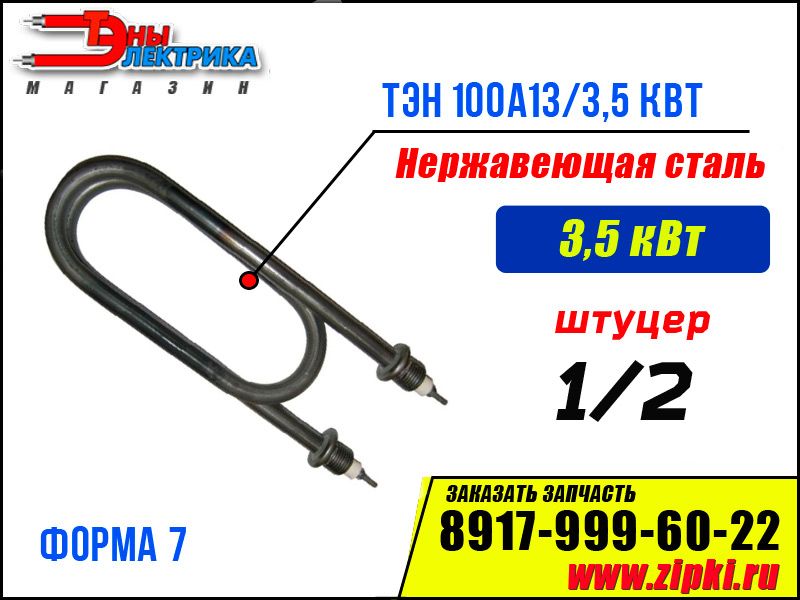 ТЭН 100А13/3,5-J-220В ф.7 R52 м.ц.117 ШТ М5 (нерж. Сталь, среда вода)
